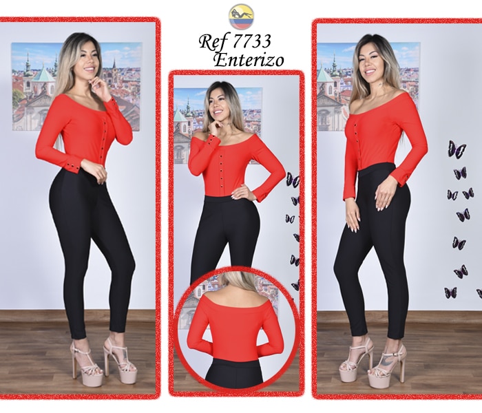 Enterizo largo de diseño elegante, en color rojo con escote amplio tipo barco y mangas largas,lleva botones decorativos en el frontal que realzan el estilo y añaden un detalle moderno.