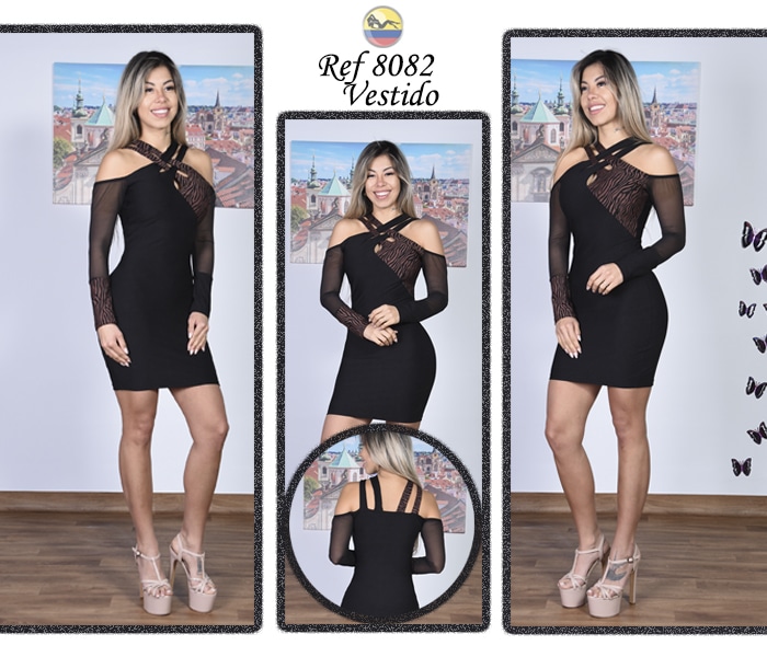 Vestido corto de estilo glamuroso, diseñado para resaltar tu figura con elegancia y sensualidad. Elaborado en tela suave y elástica, se adapta perfectamente al cuerpo, proporcionando comodidad y un ajuste favorecedor. Su original escote cruzado con detalles en transparencia crea un efecto visual y moderno que realza el busto.