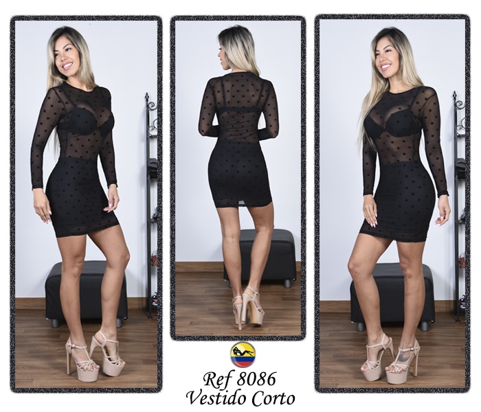 Vestido corto es la prenda ideal para quienes buscan un look elegante, moderno. Su diseño en color negro con delicadas transparencias crea un efecto atractivo, Presenta un estampado discreto en relieve que añade textura y un toque distintivo al diseño.