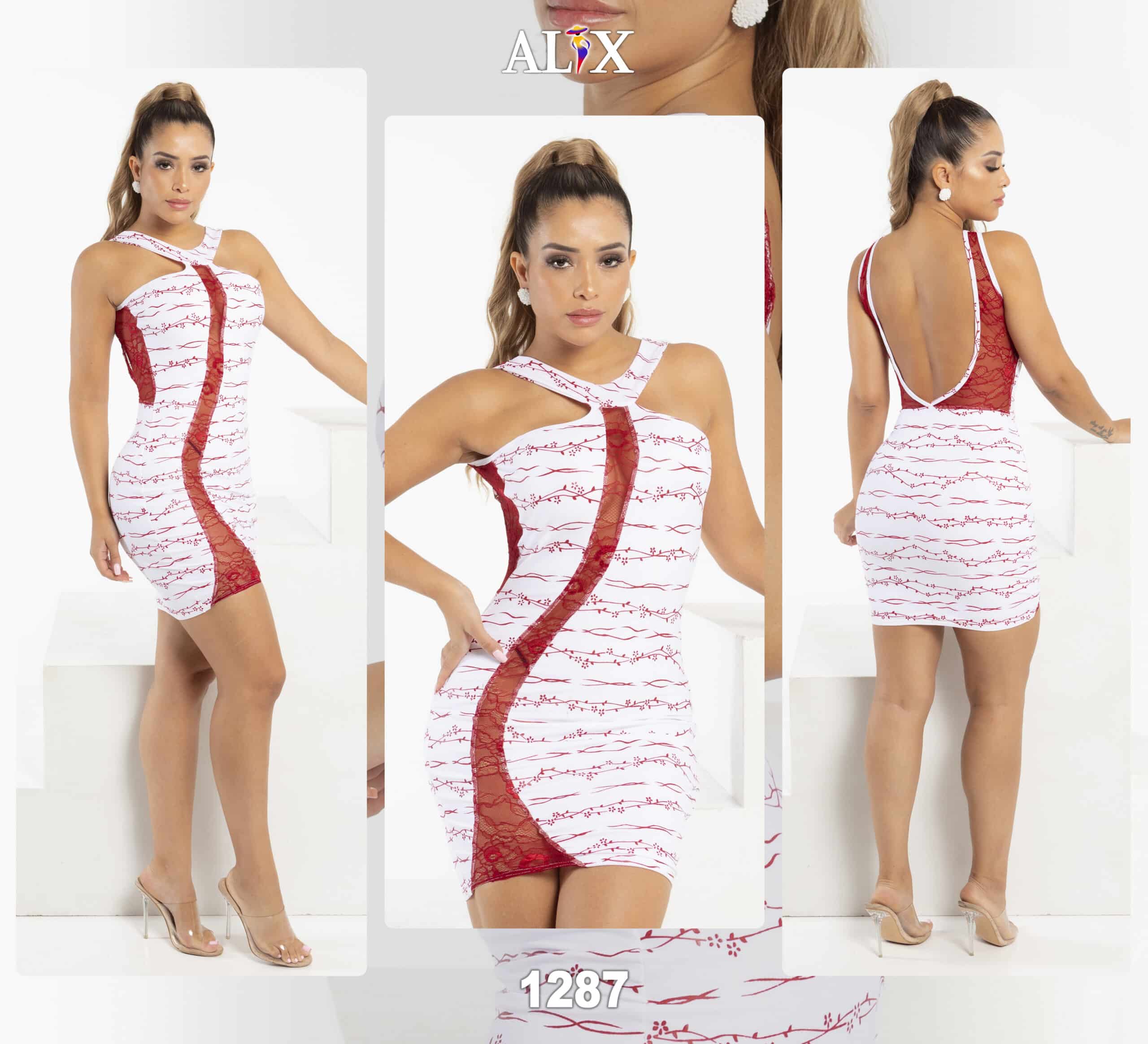 Vestido de corte ajustado, diseñado para resaltar la figura femenina. Su base es de color blanco con un estampado rojo en ramas que recorren horizontalmente toda la prenda,tiene franja curva de encaje rojo semitransparente, que atraviesa el vestido desde el hombro derecho hasta el muslo izquierdo, creando un efecto visual atrevido y elegante.